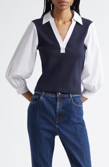 Crisp poplin juxtaposes the soft stretch knit on this mixed-media top that s ideal from work to weekend.