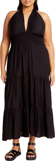 A decadently tiered silhouette and backless design will have you dreaming of somewhere sunny in this halter midi dress popped with handy pockets.
