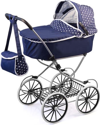 Bayer Design Dolls: Classic Deluxe Pram - Blue &White - This beautiful Classic Deluxe is a nostalgic doll s pram that is suitable for dolls up to 46 cm / 18 inches. Smooth Maneuvering - thanks to the large tires and the soft handle, the doll s pram is particularly easy to push. Protection - the cover of the tub also protects the doll from wind and sun. Folding - the doll’s pram can be easily folded for transport or space-saving storage. Storage - In the shopping basket and in the bag included, you can take practically everything you need for an outing with your favorite doll. Works for Older Kids Too - due to the high pushing height of 82 cm / 32 inch, the pram is also suitable for older children. Delivered in a beautiful showbox. Children can transport around their favorite stuffed animals, plush toy, and dolls in style. Encourages independent play and nurturing skills. Pretend play as mommy and daddy. Suitable for boys and girls ages 3 and up. Includes: 1 Classic Deluxe Pram 1 Matching Handbag.