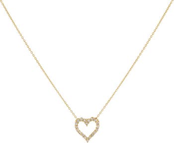 Flaunt your heart s desire for sparkling style in Adina Eden s Classic Natural Diamond Heart Necklace, featuring a diamond-adorned open heart pendant that hangs gracefully from a delicate chain. Available in three different 14K gold sheens, this gem is a sweet way to layer up any look. Pair it with your everyday 14K or another dazzling diamond necklace. It s a timeless beauty that deserves to be shown off at all times.