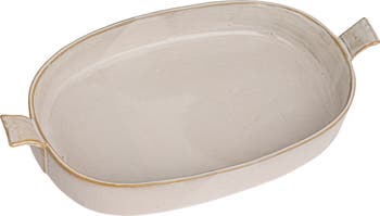 - A sleek oval stoneware baker with handles, finished in a pure white that exudes timeless charm