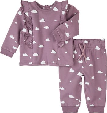 Made from soft-as-a-cloud fleece, this ensemble that pairs a ruffle-framed sweatshirt with matching joggers will keep your little one cozy while looking cute as can be.