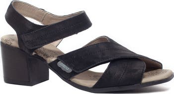 A network of adjustable leather straps arc across the cushioned footbed of this elegant sandal perched on a stacked block heel.