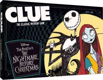CLUE: THE NIGHTMARE BEFORE CHRISTMAS - Sandy Claws has gone missing, and the mystery must be solved in time to save Christmas! Place the usual suspects of Jack Skellington, Sally, Mayor, Oogie Boogie, Dr. Finklestein, and Lock, Shock, and Barrell among popular locations in Halloween Town to piece together WHO kidnapped Sandy Claws, WHAT item was used to subdue him, and WHERE in Halloween Town he was hidden! Who kidnapped the Sandy Claws, and locked him in a box? Where could he be hidden, behind a bunch of rocks? Did someone send a present, or set a steel bear trap? It s up to you to solve the clues and find out where he s stashed. INCLUDES: 1 Game Board, 6 Custom Character Movers, 6 Weapon Tokens, 6 Personality cards, 6 Character Clue cards, 6 Object Clue cards, 9 Location Clue cards, 21 Intrigue cards, Clue Sheets, 1 Envelope, 2 Six-sided Dice, Rules.