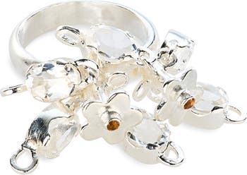 Nostalgia is refined into a movement-filled ring crafted from sterling silver with floral charms and faceted quartz.