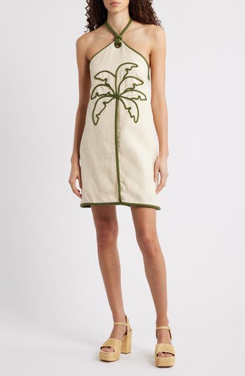 Green piping shapes a stylized palm tree and traces the outlines of this minimalist halter minidress cut from airy linen.