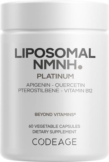 - Codeage Liposomal NMNH Platinum includes a selection of plant-based compounds, such as quercetin, apigenin from chamomile, and pterostilbene, designed to complement the NMNH formula in a high-quality composition.
