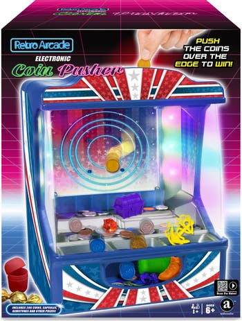 Bring the thrills and excitement of the Arcade right into your own home! The coin pusher machine is an all-time arcade favorite. Everybody loves the thrill and challenge of trying to drop the coin in the right spot at the right time to cause a cascade of coins to fall over the edge. This home use version has all the fun of the arcade game, with moving shelves, dual ledges, colorful LED light effects, and arcade music. There are even 5 fun ways to play the game: 1) Prize Capsules: fill the capsules up with candy or other prizes, then place overtop the coins. Players drop in the coins to try to get the capsules to fall over the edge to win the prize! 2) Gemstones: place the colorful gems on top of the coins - the first to collect 3 wins! 3) Target Score: each coin includes a value number. The first to accumulate a total value of 2000 coins wins! 4) Buried Treasure: mix the 5 treasure pieces with the coins - whoever captures the most wins! 5) Real Coins: place real coins on the shelves, then use the plastic coins to push them over the edge to win! With all these options the arcade coin pusher is sure to keep everyone entertained for hours! Requires 4 x C batteries (not included). Recommended for ages 6 and over.