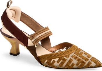 Dimensional logo embroidery and sporty stretch straps make an unexpected pairing for a pointy-toe pump set on a stubby kitten heel. A cushioned heel pad with pull loop adds another utility-chic element.