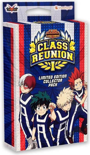 MY HERO ACADEMIA COLLECTIBLE CARD GAME CLASS REUNION COLLECTORS PACK - It’s time for the annual Class Reunion! This My Hero Academia: Collectible Card Game Class Reunion Collector Pack introduces 11 brand new cards to the game. Collect these cards in gorgeous foil! Each Collector Box contains 4 random foil cards from the group of 10 alongside 1 guaranteed new foil card; “The Future is NOW!”. Also included are 4 My Hero Academia: Set 4 League of Villains booster packs, making for a perfect gift for both collectors and players!OFFICIALLY LICENSED COLLECTIBLE CARD GAME: My Hero Academia comes to the tabletop! Fans of trading card games can test their (all) might in this tense and strategic dueling card game. As an officially licensed product, MHA CCG is loaded with incredible art of your favorite heroes!
