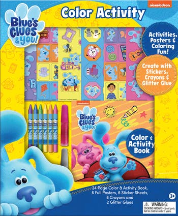 INKOLOGY: BLUES CLUES COLOR ACTIVITY SET - 24-page coloring and activities book. Bring the fun and learning of Blue’s Clues to life with this colorful and engaging Blue’s Clues Color Activity Set by Inkology. Packed with creative tools and activities, this set inspires kids to color, decorate, and design their own imaginative masterpieces. With 24 pages of activities and coloring fun, plus posters to decorate, little fans of Blue and her friends will have hours of entertainment at their fingertips. The set includes everything children need for artistic play—stickers, crayons, and glitter glue—to add sparkle and personality to their creations. Perfect for home, classrooms, parties, or travel, this activity kit helps develop fine motor skills, creativity, and self-expression while keeping kids entertained. Made with safe, child-friendly materials, this set is designed for children ages 3 and up and makes a thoughtful gift for birthdays, holidays, or any special occasion. Whether your child loves to color, decorate, or craft, this Blue’s Clues Activity Set is the perfect way to combine fun, learning, and creativity.
