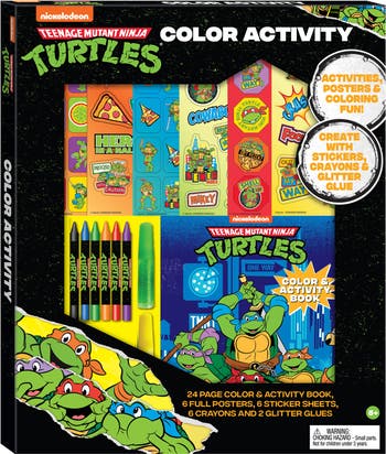 INKOLOGY: TMNT COLOR ACTIVITY SET - 24-page coloring and activities book. Unleash action-packed creativity with the Teenage Mutant Ninja Turtles Color Activity Set by Inkology! Perfect for young fans of Leonardo, Donatello, Michelangelo, and Raphael, this exciting set is packed with everything kids need for hours of coloring, decorating, and imaginative fun. Inside, you’ll find a 24-page activity book filled with fun designs and creative prompts, plus posters to decorate and bring to life. With stickers, crayons, and glitter glue included, children can create their very own Turtle-powered masterpieces. Whether they’re coloring their favorite ninja hero or decorating a poster, this kit inspires creativity while encouraging self-expression and fine motor skill development. Designed for kids ages 5 and up, this licensed TMNT activity kit makes a perfect gift for birthdays, holidays, or any day of fun. Ideal for home, classrooms, parties, or travel, it’s a creative and screen-free way to keep children entertained. Fans of the Teenage Mutant Ninja Turtles will love combining their imagination with the heroes in a half shell!