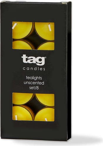 - Set of 8 tealight candles made from paraffin wax measuring 1.5 inches in diameter and 0.15 inches in height with a 3-hour burn time. Brighten your home decor with cheerful yellow tealight candles for any occasion. Keep your tealight candles clean by spot or wipe cleaning them regularly to maintain their appearance. Always trim the wick to 1/4 inch before each use, especially after every 4 hours of burn time, to ensure a clean and even burn. Extinguish the flame and allow the candle to cool to room temperature before trimming the wick. Celebrate the season with the cheerful glow of our set of eight yellow tealight candles perfect for gift giving and enhancing any occasion with their vibrant color and long burn time.