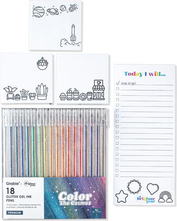 - Includes 3 sets of color-your-own post-it notes, color-your-own list pad, and 18 glitter gel pens