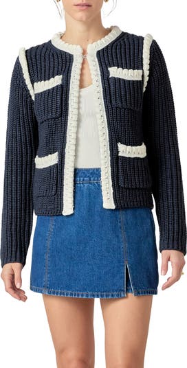 Contrast trim extends the vintage-chic style of this cozy ribbed cardigan.