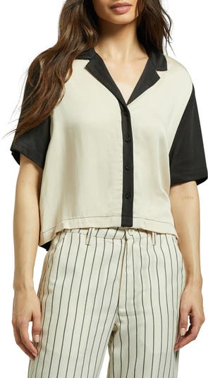 A boxy fit and colorblocked design ramp up the retro charm of this playful camp shirt cut from a drapey, silky woven fabric.