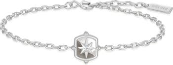 A hand-polished charm featuring a crystal-sparked eight-point star set against colorblocked mother-of-pearl inlays centers this delicate chain bracelet.