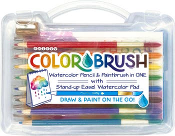 Take creativity with you wherever you go with this compact travel set featuring eight Colorbrush watercolor pencils with paintbrush tips so you can paint or draw at any time. A small watercolor sketchpad that can be used as a standing easel and a wooden sharpener complete this set.