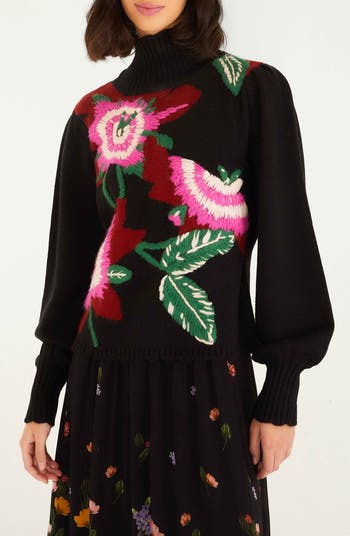 Voluminous bishop sleeves frame this woolly turtleneck sweater knit with bold blooms in signature vivid hues.