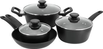 Get creative in the kitchen with thie all in one Oster Connelly 7 piece cookware set. Constructed of durable aluminum that heats and cooks evenly for consistent results and coated in a textured nonstick interior for scratch resistance and easy food release. This sturdy set is made with bakelite handles that stay cool for safe mobility, and includes vented glass lids for easy monitoring. Set comes with one dutch ove, two saucepans, and one frying pan, completing all your daily cookware needs. Set your meals up for success with this versatile set that will stand the test of time! Dishwasher safe, avoid harsh chemicals.