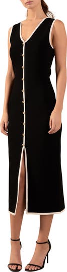 Glinting buttons front this close-fitting sweater-dress designed with contrasting trim for visual interest and punctuated with a leg-revealing front slit.