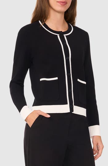 Contrasting trim adds bold definition to this cardigan knit from fine, soft yarns in a style that easily walks the line between casual and polished.