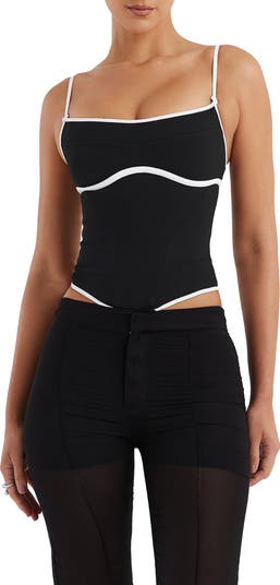 Delicate contrasting trim frames this structured top designed with corset-inspired details like boning and underwire cups.