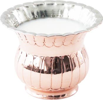 Immerse yourself in the allure of a French summer with our Vintage French Inspired Peach Sangria Candle. This exquisite candle combines the sweet, invigorating scent of peach sangria with the timeless elegance of a vintage-inspired design, creating an ambiance of old-world romance and warmth. Crafted from soy wax, known for its clean burn and strong fragrance throw, the candle is poured into a copper embossed jardinière that we ve lovingly designed. Drawing inspiration from an antique vessel from our previous collection, this jardinière boasts a charming French inspired embossed pattern and a delicately fluted edge, evoking the beauty and sophistication of France s storied past. As the candle illuminates your space, it releases our signature peach sangria scent, enveloping you in its sweet embrace and transforming any room into a cozy, inviting haven. But the journey doesn t end when the candle has burned down. The copper jardinière, a masterpiece in itself, is designed to be easily cleaned and preserved as a family heirloom, serving as a decorative piece that continues to tell stories for generations. This Vintage French Inspired Peach Sangria Candle is more than just a candle; it s an experience, a piece of art, and a bridge to a bygone era, perfect for those who cherish the elegance of the past and the simple pleasures of home. Filled with 18oz of soy wax Care instructions come with the piece Dimensions: 5.25" Diameter x 4" Top: Peach Sangria, Strawberries, Blackberries, Mandarin Rind Medium: Lemon Fizz, Pomegranate Bottom: Pink Champagne, Musk, Sugar Cane About Coppermill Kitchen Coppermill Kitchen marries vintage character and modern luxury to produce pieces with a timeless style and functionality. Designed with an expert eye for detail, each piece has a story to tell and will be cherished for generations to come.