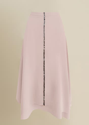 This elegant long skirt is crafted from a drapey fabric, designed to flow beautifully with every movement. Featuring an array of real shell buttons, it exudes a sense of refined detail and timeless sophistication.