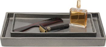 A burlap texture enriches a ceramic nesting tray to keep your vanity organized and your items out on display.