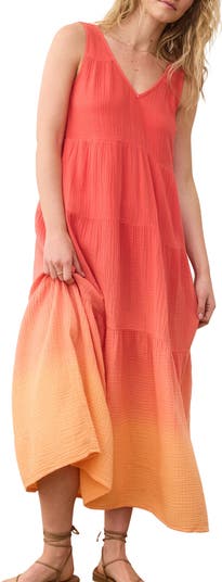 A dreamy, dip-dyed design brightens a flowy, tiered maxi dress cut from double-cloth cotton that s opaque and softly textured.