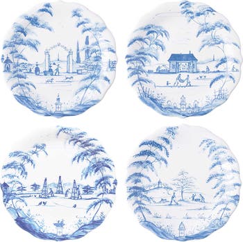 Create a charming tablescape with these scalloped ceramic plates featuring a picturesque country-estate design developed in collab with renowned English artist Deborah Sears. Each features an idyllic scene set in an apple orchard, rose arbor or spring garden.