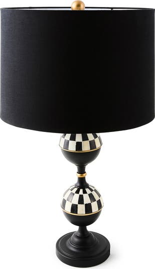 Bold checks and goldtone accents add to the striking effect of this tabletop lamp topped with a circular lampshade.