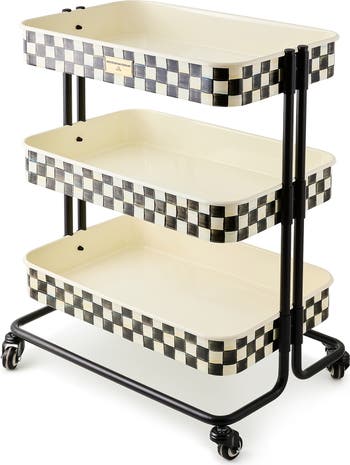 Fixed trays made with heavy-gauge steel feature a signature hand-painted check pattern that instantly elevates a rolling cart featuring three tiers perfect for hosting or elegant storage.