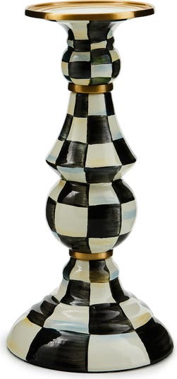 Elevate your illumination situation with the hearty presence of this candleholder that s hand-painted with color-dragged checks highlighted with gilt details that amplify your candle s flame.