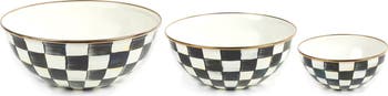 Elevate your baking session with this set of three stunning mixing bowls hand-painted in Mackenzie Childs signature Courtly Checks. Each bowl is crafted with a heavy-gauge, hand-glazed steel underbody and rimmed in bronzed stainless steel.