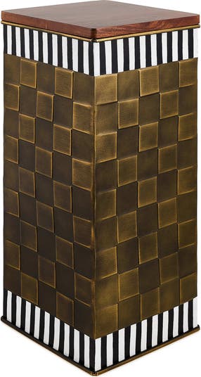 Hand-painted stripes and a dimensional embossed check pattern lend courtly appeal to this tall storage bin that s an elegant addition to any entryway.