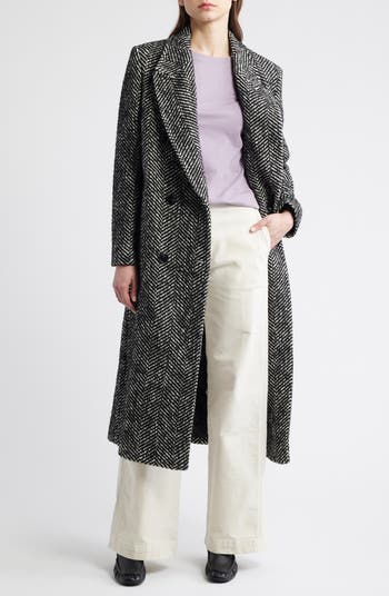 A touch of wool and classic herringbone weave bring enduring sophistication to a double-breasted longline coat tailored with notched lapels.