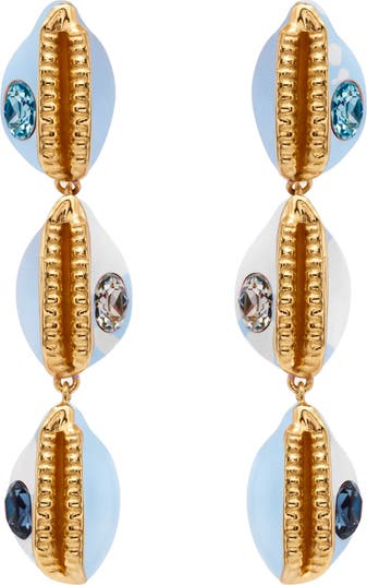 The label draws inspiration from the aquatic beauty of the ocean with these resort-ready drop earrings designed to look like cowrie shells covered in enamel and detailed with sparkling crystals.