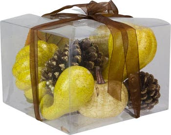 Add a vibrant touch of autumn color to your home throughout many years to come with these reusable artificial decorations. This pack comes in a set of 12 with pumpkins, pine cones, gourds, and leaves in fall colors. These autumn-inspired decorations will bring absolute personality to your indoor decor with its beautiful designs. Perfect for autumn weddings or your Thanksgiving decor. Features; Autumn fall tabletop figures Features pumpkins, gourds, pinecones, and leaves Colors of off white, brown, gold, green, and orange There is a crackled and glittered design on the figures The fall figures come in an acetate box with a sheer brown ribbon tied into a bow Recommended for indoor use only Dimensions: Assorted sizes range from 2.5" - 4" high Material(s): wood/foam/fabric