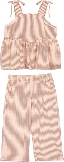 - This girls 2PC set features a red and cream striped pattern with a breezy sleeveless top and coordinating wide-leg pants. The top has adjustable tie straps and a gathered bodice for a relaxed fit, while the elastic waistband on the pants ensures comfort. Perfect for warm-weather outings and stylish everyday wear. Fabric Care 65% COTTON 35% VISCOSE Machine Wash Cold