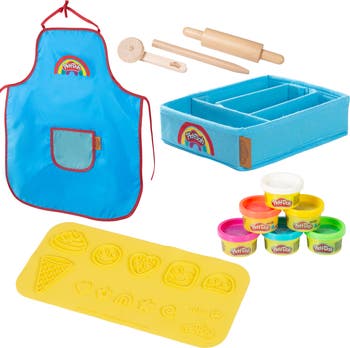 PLAY-DOH: CREATIVE PLAYSET - The Play-Doh Set is an all-inclusive play experience designed to bring out the creativity in young artists while keeping things tidy and organized. This set includes a water-resistant craft apron to keep kids’ clothes clean as they explore their imagination with hands-on play. The sturdy canvas storage box provides a dedicated space to neatly store tools and accessories, making cleanup simple and convenient. Essential tools like a rolling pin, pizza cutter, and modelling tool allow children to craft a variety of shapes and designs, encouraging fine motor skills. This set FEATURES FSC-certified wooden tools and BPA Free Silicone. The 3D creative silicone play mat (measuring 14.5 x 30 cm | 5.71 x 11.81 inches) adds an exciting, textured surface to inspire creativity. With six vibrant 1 oz Play-Doh clay colors—red, yellow, blue, green, white, and berry—kids have endless possibilities to mix, mold, and build colorful creations. This Play-Doh Set is perfect for promoting imaginative play and skill-building, making it a must-have for any play space! Materials: Play mat: 100% BPA-free silicone. Modeling compound: Material blend (incl. flour, water, salt, color pigments). Wooden tools: 100% FSC-certified solid wood. Craft apron: 100% polyester. Storage box: Exterior: 100% canvas, Interior: cardboard. Playset INCLUDES: 1 Apron, 3 Wooden Tools, 1 Canvas Storage Box, 1 Silicone Mat, and 6 containers of Play-Doh.