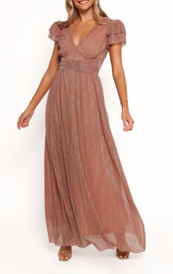 A shimmer-simmered dress delights with pretty puff sleeves and a swishy, full-length skirt.
