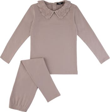 This stylish set includes a long-sleeve top with a Peter Pan collar and full-length leggings, perfect for any occasion.