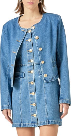 Glitzy golden buttons secure this cropped nonstretch-denim jacket designed with light padding at the shoulders for a polished, modern silhouette.