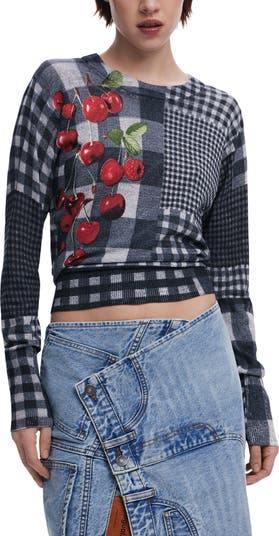 Featuring a patchwork of lively checks, this close-fitting cropped sweater is sweetened with delicious cherries.
