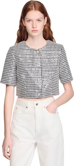 Cropped houndstooth tweed jacket with sequin embellishments, a round neckline, jewel button fastening and short sleeves.