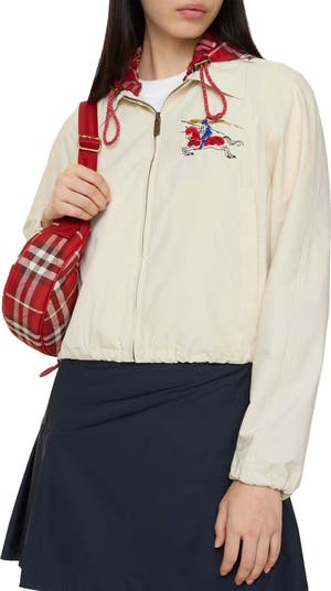 The classic Harrington jacket is reworked in a lightweight stretch nylon twill, with a detachable Burberry Check hood for unpredictable British weather. The cropped silhouette is cut to a relaxed fit with raglan sleeves for a softly curved shoulder. Our Equestrian Knight Design is embroidered at the chest in textured and metallic threads – created as part of our Year of the Horse capsule.||Zip closure|Detachable drawcord hood|Side zip pockets|Drawcord hem and cuffs|Embroidered Equestrian Knight Design at chest|Comes with a garment bag