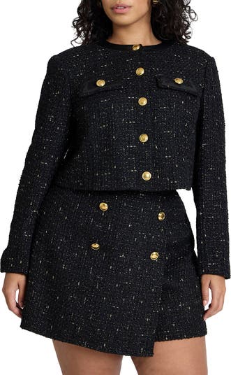 A cropped tweed jacket with a jewel neckline, strong shoulders, and polished buttons.