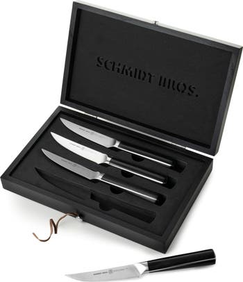 - This Set Contains: Four razor-sharp 4.5" Steak Knives engineered for a comfortable grip; Delivered in an elegant, black box perfect for a gift or keepsake. Technical Details: Blade Hardness: 59 +/- HRC